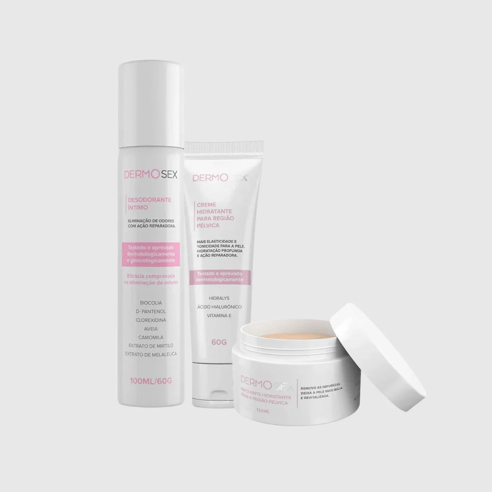Esse kit foi criado para presentear ou se presentear com os produtos must have da sua rotina de cuidados íntimos. Esfoliante Dermosex: Purifica, suaviza e revitaliza instantaneamente. Com grânulos naturais e ingredientes como óleo de uva, babaçu e manteigas de cacau e karité, sua pele fica fresca e nutrida.